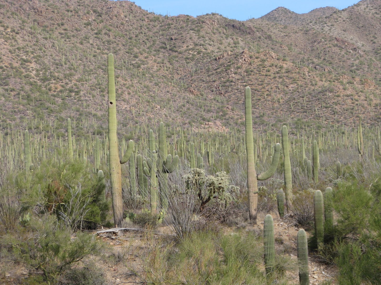 Several different types of cactus in the area. I think everyone recognizes the prickley pear..The Saguaro can just be one fat pole...or, as we usually think of it...have several arms.